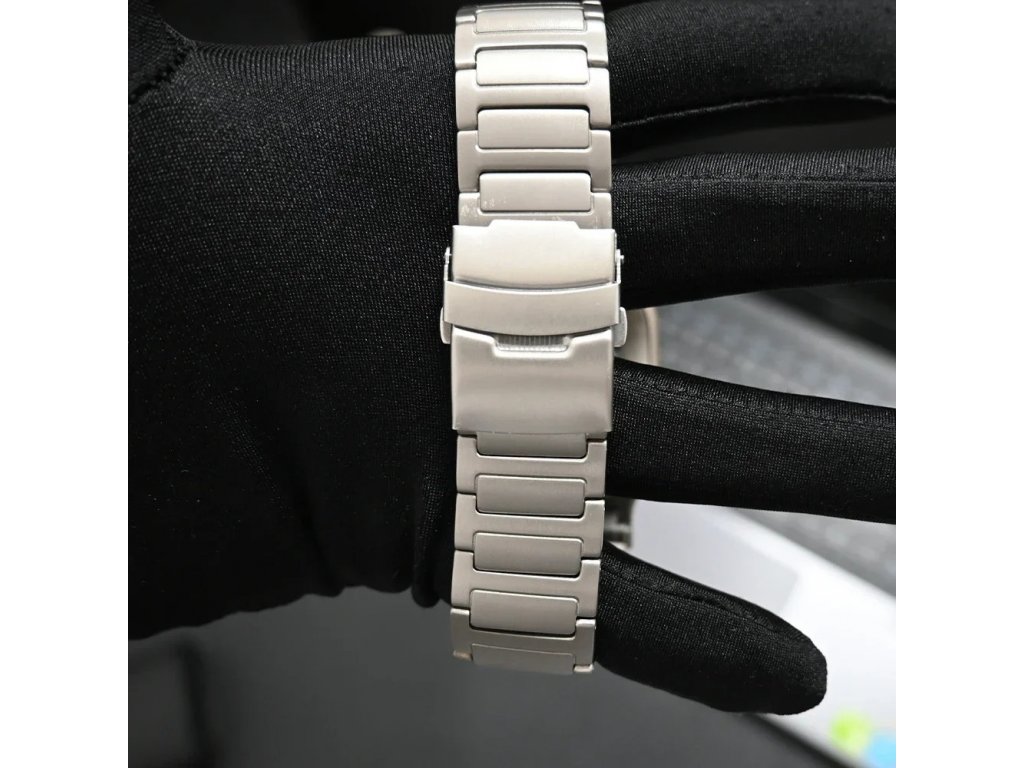 Titanová slitina je mnohem lehčí než klasické kovové řemínky. Tento řemínek váží 99g, při kompletní délce (obvykle je nutné zkracovat, takže výsledná váha bude nižší). Kovová upínací spona, titanový řemínek.