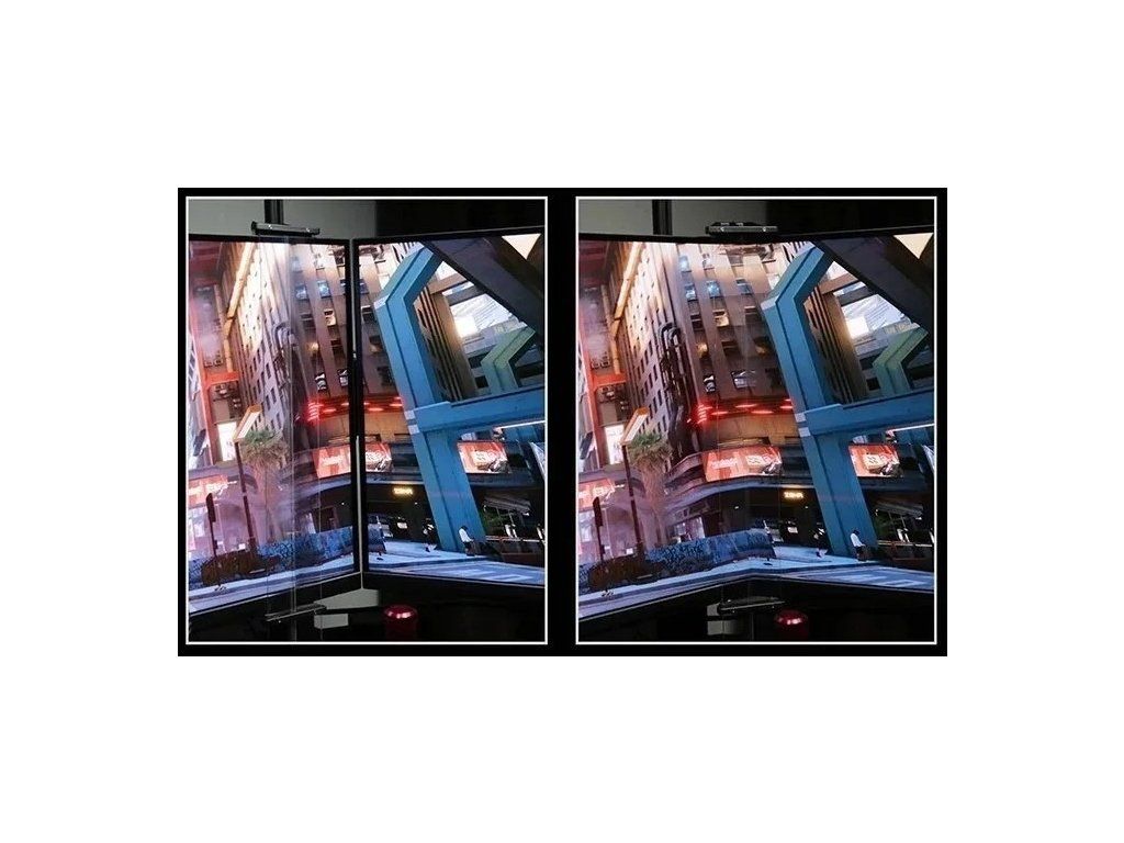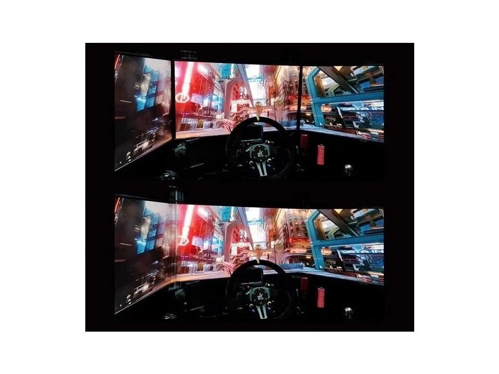 ⚠️ Upozornění: Produkt pracuje na principu optického lomu světla – drobné zkreslení v místě spojení monitorů je přirozenou vlastností této technologie.