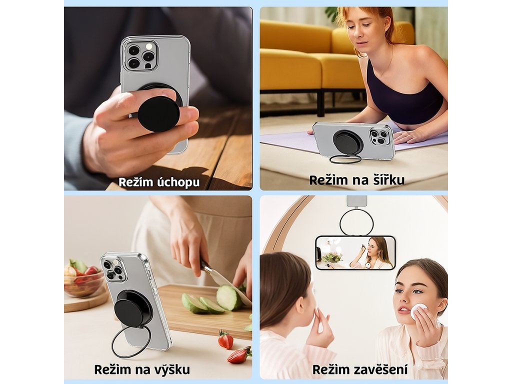 Magnetické desky + prstencový úchyt: umožňuje bezpečné držení telefonu, když píšete, fotíte nebo surfujete na internetu.
